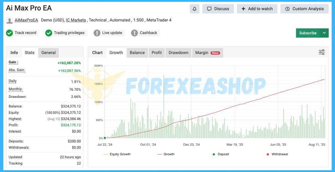 - Verified MyFxBook results showing gains above 160,000 percent and a drawdown below 5 percent highlight its scalability, positioning AiMaxPro EA as a professional-grade trading solution for both small accounts and prop firm challenges.
