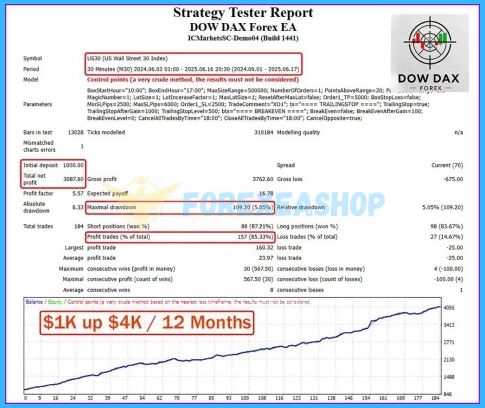 Dow Dax Forex EA is a fully automated trading system developed for the MetaTrader 4 platform. It is designed to trade the high-volatility index markets of Dow Jones (US30) and DAX (GER30) with precision. The EA operates on the M30 timeframe using a box breakout strategy, time-based filters, and dynamic trailing logic to capture fast market movements. With a minimum deposit of 200 USD and recommended leverage of 1:500, it provides a professional solution for traders looking for consistent performance.