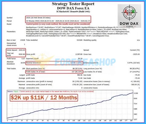 - Dow Dax Forex EA is a fully automated MT4 trading system designed for US30 and GER30 indices, applying a box breakout strategy with time-based filters and smart trailing logic on the M30 timeframe to capture high-volatility market movements with disciplined risk control.