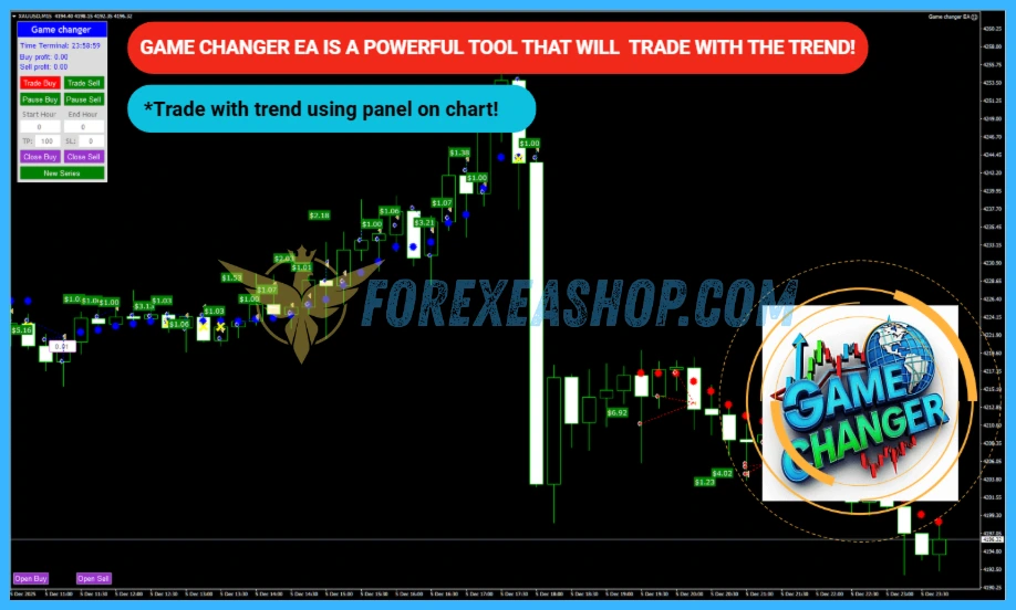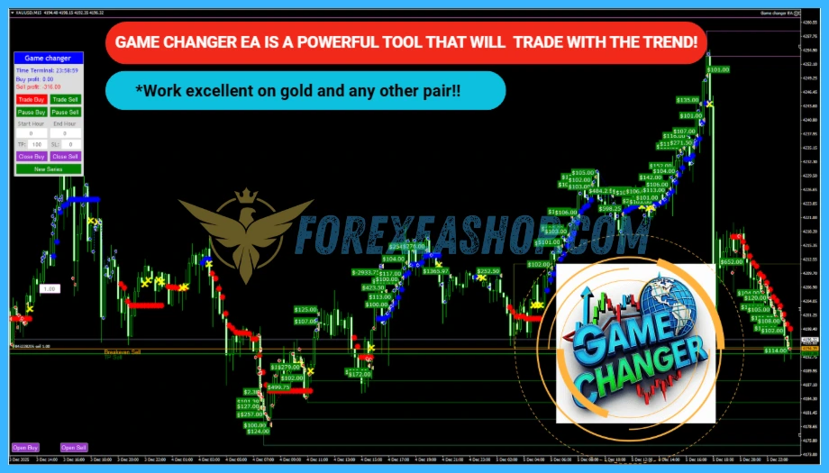 - EA Game Changer is a MetaTrader 4 automated trading robot built around a structured trend following strategy that interprets Game Changer indicator signals, analyzes market direction and momentum, and executes disciplined buy and sell cycles automatically with optimized performance on Gold XAUUSD in the M15 timeframe.