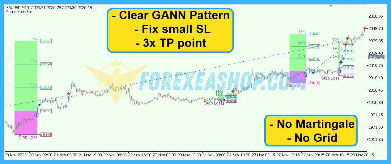 - Gann Gold EA MT4 is an automated MetaTrader 4 trading robot designed for XAUUSD that applies classic Gann trading methodology, price cycle analysis, and AI assisted market filters to detect breakout opportunities, trend continuation signals, and high probability gold trading setups on the M15 and M30 timeframes.