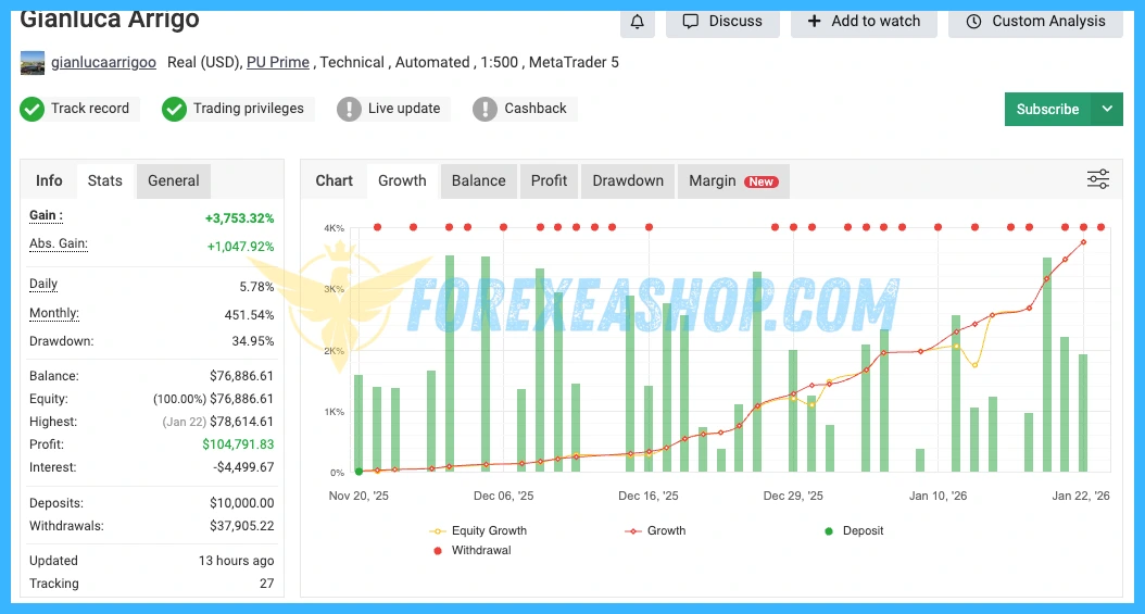 Experts Advisor on PU Prime account 1:500 profit +3753.32%
