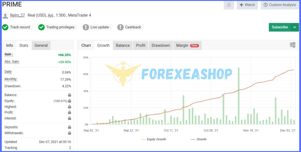 Expert Advisor on Axi account 100k 1:500 profit +66.35%, Daily: 0.04%, Monthly: 17.29%, Drawdown: 4.22%