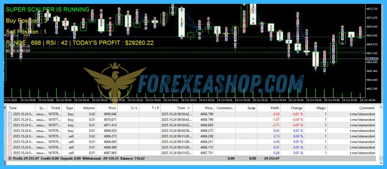 Super Scalper Gold Killer provides a focused and specialized approach to automated Gold scalping on MetaTrader 5. Its emphasis on speed, precision, and short trading cycles makes it suitable for traders seeking frequent opportunities in controlled market conditions. The EA is simple to deploy, optimized for XAUUSD, and structured to operate efficiently during specific trading sessions. Traders looking to enhance their Gold scalping strategy with automation can integrate this EA as a practical trading tool.