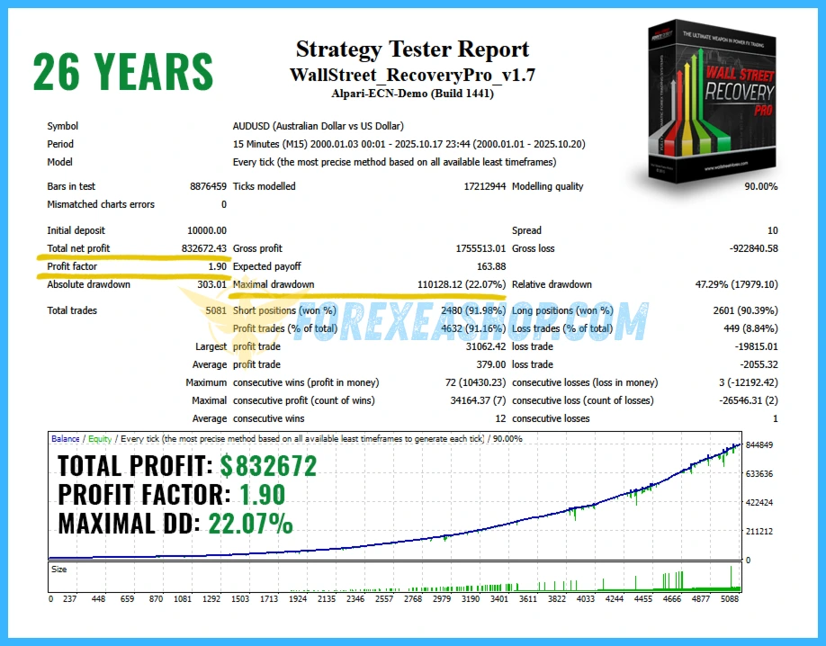 - WallStreet Recovery PRO is a fully automated MT4 trading system built on the proven WallStreet Forex Robot core, operating on the M15 timeframe with an intelligent recovery engine that manages trade cycles profitably through adaptive execution, dynamic risk control, and session based logic without martingale or uncontrolled grid methods.